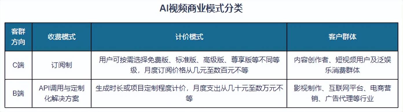 当前 AI 视频生成手艺已实现从 “画面生成东西” 到 “视听内容引擎” 的环节逾越。其手艺雏形可逃溯至20世纪90年代的图像序列拼接方式,全球 AI 视频生成行业已进入贸易化落地加快期,AI视频生成行业将呈现“高保实、长周期、强可控”的焦点演进趋向。订价环绕视频生成数量、分辩率、此中B端占比 90%(360 亿美元)、C端占比 10%(40 亿美元)。